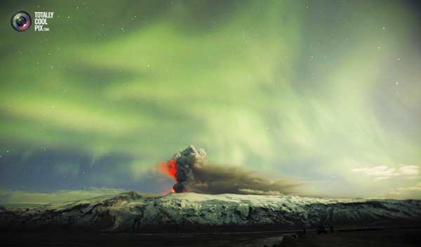 Это привело не только к гибели множества обитателей океана, но и нарушило водный обмен в атмосфере. Генератор циклонов остановился, течение Гольфстрим разрушилось. В результате произошло наводнение в Европе и жара в России. Нанесен колоссальный экономический ущерб и многочисленные жертвы среди населения. Специалисты утверждают, что столь длительный блокирующий антициклон в России 2010 года был удержан также с помощью системы ХААРП. ![]() Вот фото 22 апреля 2010 года, на котором мы видим характерное для системы ХААРП искусственное полярное сияние над вулканом в Исландии, которое показывает, что извержение было вызвано с помощью климатического оружия. Про диверсию, вызвавшую взрыв скважины в Мексиканском заливе уже писали, поэтому я повторяться не буду. Необходимо сказать ещё о том, что северные широты очень насыщены мощными источниками электро-магнитного излучения. Это и различные радары, и ионосферные нагреватели ХААРП на Аляске, в Гренландии и в Норвегии (Тромсе).