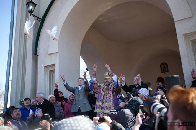 После Литургии он прошел с православными крестным ходом вокруг собора, это Вы видите на съемках и фотографиях. По окончанию крестного хода на ступеньках собора православный епископ Лукиан с католическим епископом Кириллом Климовичем и губернатором области Кожемяко выпускали белых голубей - благословляя православных клириков, монахов и мирян. После было вручение подарков и целование на амвоне с католиком...