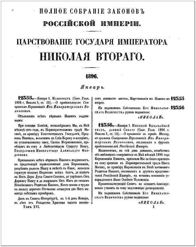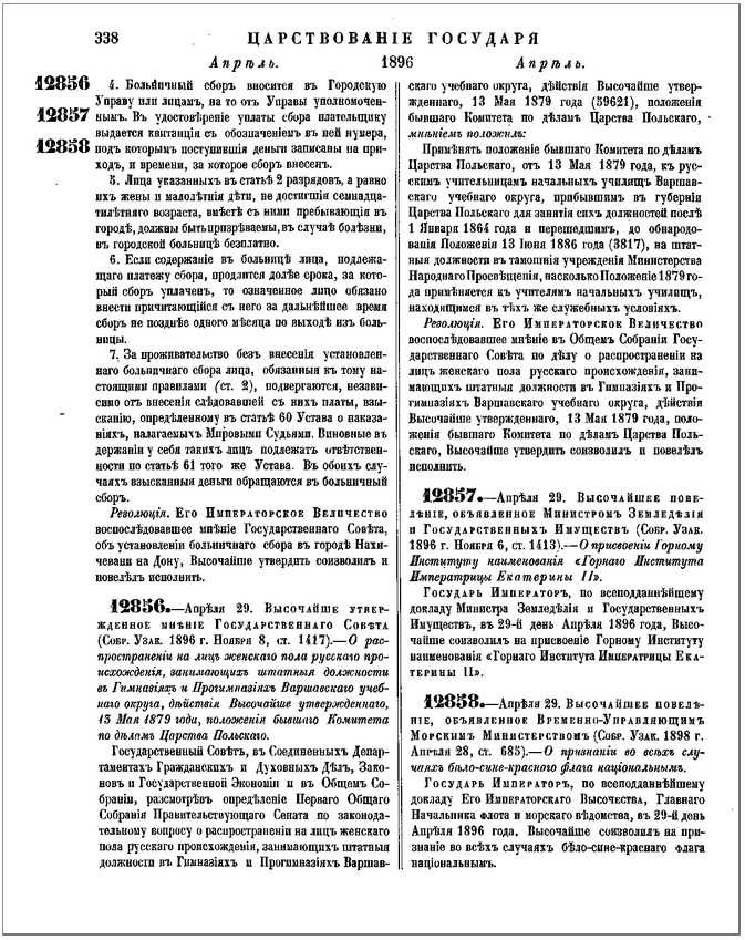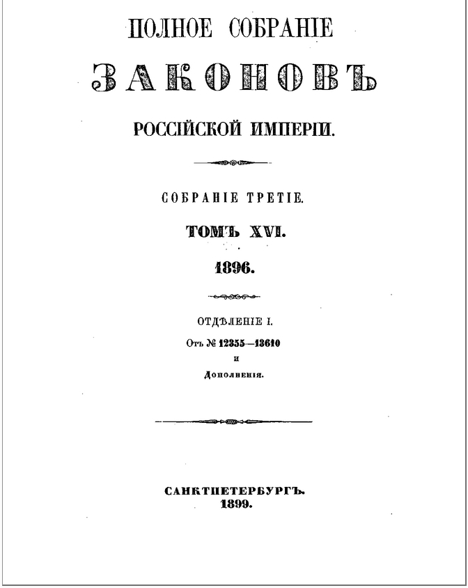 «Полное собрание Законов Российской Империи. Царствование Государя Императора Николая Второго» (Том XVI, отделение I, 1896 год, стр. 338)