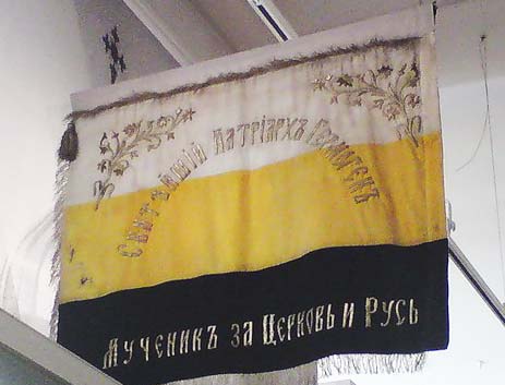 А сейчас, внимание! Вот (ниже) знамя СОЮЗА РУССКОГО НАРОДА. И оно вовсе не чёрно-желто-белое, как у сегодняшних их т.н. последователей. Поэтому, если они себя считают и называют преемниками дореволюционного СРН, то пусть возьмут себе бело-сине-красный флаг.