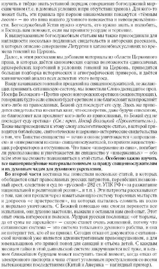 Из самых разных источников в нём собраны интересные и полезные материалы, призванные помочь православным не растеряться и грамотно себя повести в очень непростых условиях нашего апостасийного времени. Издание вестника готовится к выпуску в крупноформатном, легко читаемом варианте (в виде журнала).