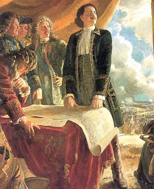 «Здравствуйте сыны Отечества, чада Мои возлюбленные!» – обращался Царь к своим воинам. «Потом трудов моих создал Я вас; без вас Государству, как телу без души, жить невозможно! Вы, имея любовь к Богу и Вере православной, на тысячи смертей устремлялись небоязненно. Храбрые дела ваши будут незабвенны у потомства». Войска, под торжественные звуки военной музыки брали оружие «на караул», склоняли взятые с боя шведские знамена и отвечали Великому Государю громовым «Слава!», «Виват!» и русским «Ура!». |