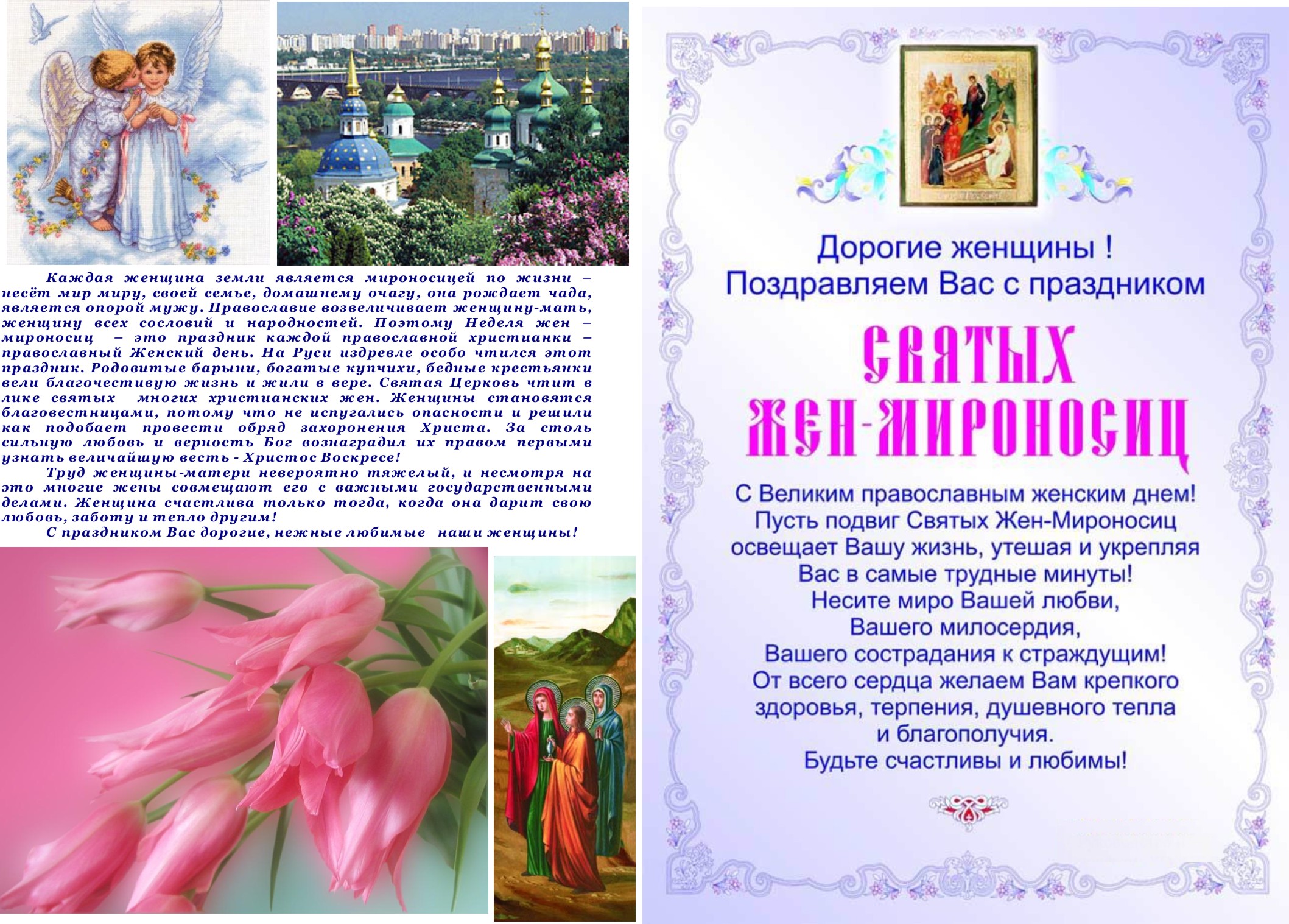 С праздником святых жен мироносиц. Письмо в редакциюУважаемая редакция, лично я каждый год сталкиваюсь с проблемой поздравления своих коллег-женщин на работе с женским праздником. Использую, по возможности, интернет. При помощи интернета я уже несколько лет готовлю поздравительные адреса к Дню святых жен - мироносиц. Их можно скачать и распечатать на любом цветном принтере, а еще лучше - заламинировать.