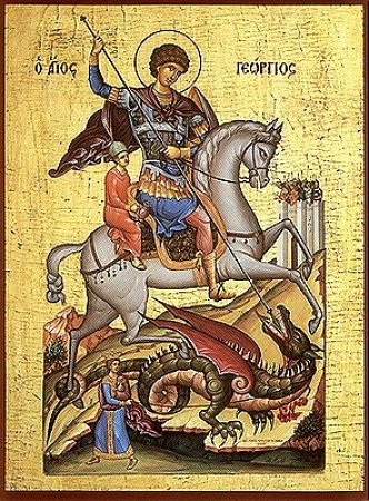 На иконах св. Георгий изображается сидящим на белом коне и поражающим копьем змия. Это изображение основано на предании и относится к посмертным чудесам святого великомученика Георгия. Рассказывают, что недалеко от места, где родился св. Георгий в городе Бейруте, в озере жил змей, который часто пожирал людей той местности. Что это был за зверь — удав, крокодил или большая ящерица — неизвестно.