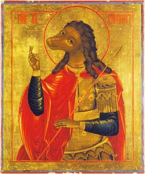 Увидев сего, старец вооружился спасительным знамением креста и с дерзновением спросил: "Послушай ты, в каком месте раб Божий обитает?" Зверь же преклонился от слов святого и, не имея возможности сказать голосом, показал рукою сторону, в какую нужно было идти к рабу Божию, и удалился быстрым бегом от преподобного Антония. Удивлялся старец видению сего зверя и пошел, куда было указано. Придя на некое каменистое место, старец увидел иного зверя, который также был до полу подобен человеку, но прочая же часть его тела была зверская — ноги козлиные и рога на голове.