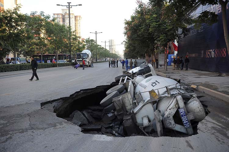 20. 28 сентября 2012 на дороге в городе Сиань в провинции Шэньси образовалась дыра, куда рухнул цементовоз. (Фото Reuters | China Daily):