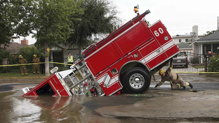 2. 8 сентября 2009 в Лос Анжелесе от взрыва водопровода образовалась дыра, куда угодила пожарная машина. Никто из пожарных не пострадал. (Фото AP Photo | Nick Ut):