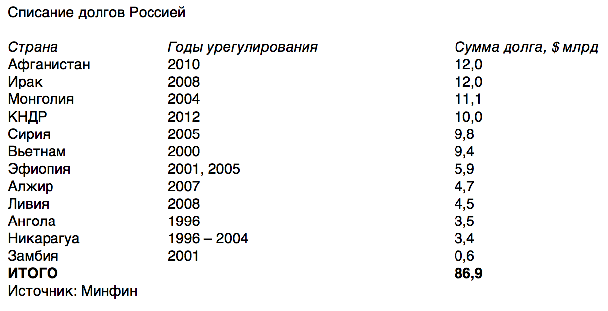 А дальше понеслось: 2003 год – прощено 12 млрд.долл. Ираку, 2007 год – 11,1 млрд. Монголии и 4,7 млрд. Алжиру, 2008 год – 7,8 млрд. опять Ираку и 4,6 млрд.долл. Ливии, 2010 год – 12 млрд.долл. Афганистану и 20 млрд.долл. группе африканских стран, 2012 год – 12 млрд. Северной Корее и 0,5 млрд.долл. Киргизии.