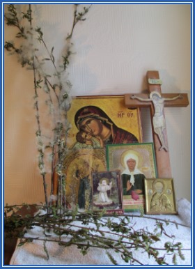 После литургии пришла вся сиявшая, радостная − да ещё и внуков привезли − в общем, всё радостно. Вербочки веточки выделила дочери, сестре старшей и свекрови, а свои оставшиеся положила к иконкам. Часов в десять вечера внучки говорят, что это летает вокруг?? Я не обратила внимание, а на утром перед заутренней молитвой увидела, что летало − это моя вербочка вся пухом покрылась. И стоят эти веточки без водички, а распускаются… В само вербное воскресение после службы в церкви тоже раздавали такие же ветки вербы (они в церкви переночевали освящённые) и их я тоже положила перед иконками и маме отнесла немного.