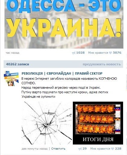 Вот, что пишут в соцсетях люди с Украины после этих трагических событий в Одессе: Что же вы наделали, "украинцы" Одессы? Кто теперь захочет с вами "единиться"? "После сегодняшних событий, сотворенных по приказу Киева, у меня, как человека, не осталось ни капли жалости к людям, поддерживающим майдан, к людям-гражданам Украины, которые сегодня в Одессе сожгли десятки человек, заживо, собственноручно, коктейлями молотова в здание исполкома. В моем нутре кипит одна лишь ненависть, во мне посеяно зерно, которое будет передаваться из поколения в поколение, несущее дикую жажду мести, воцарения справедливости, в моей душе закопано семя, основной задачей которого будет являться гонение той части новосотворенной украинской нации, которая поддерживает незаконную власть, которая кричит без разбора ситуации, словно дикое животное, "Слава Украине", которое избрало для себя идолом Бандеру. Для меня исчез тот псевдо-образ украинца-брата, ибо на Украине живут русские люди, а кто себя таковыми не считает - мрази, быстрым концом которых должна стать одна лишь смерть."