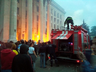 По словам Юрия, по отношению к ним сразу же применили травматическое и огнестрельное оружие. "Парня, находившегося возле меня, сразу же "уложили". Нас загнали внутрь здания и отрезали все пути отхода. Я очутился в правом крыле 3-го этажа, нас человек десять было в какой-то комнате. Правосеки начали забрасывать здание "коктейлями молотова" и стрелять по окнам. Первый этаж горел, потом - выше, дым распространился по коридорам, выйти было нельзя... Мы открывали и выбивали окна, но это не спасало: дым с улицы затягивало в помещение. Кто-то выпрыгивал, их внизу добивали. Снизу кричали "Слава Украине" и "Смерть врагам"... Это был ад! Приехали пожарники, начали тушить 1-й этаж..." - рассказывает очевидец.