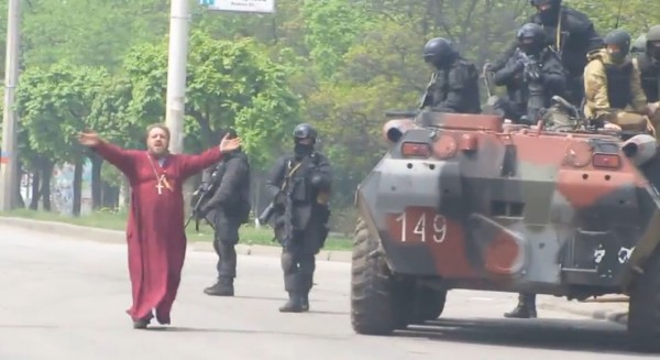 Настоятель храма блаженной Ксении Петербургской г. Краматорск протоиерей Сергий Миронов остановил колонну украинских войск и поспособствовал выводу за территорию города. Батюшка в тельняшке и с георгиевской лентой уговаривал украинские подразделения на БТР-ах покинуть Краматорск, чтобы не провоцировать мирных жителей. И они вняли доводам священнослужителя, отправившись за черту города.