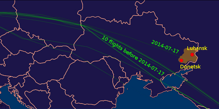 Источник: скриншоты с сайта FlightAware.com, скомпилированные Вагелисом Кармиросом, сопоставившим все недавние траектории полета рейса МН17, отслеживавшиеся FlightAware, которые показывают, что тогда как все десять последних траекторий пролегали на безопасном расстоянии к югу от Донецкой области и пересекали зону над Азовским морем, только 17 июля трагический рейс МН17 проходил непосредственно над Донецком