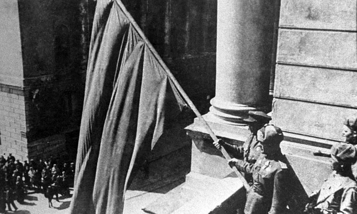 Снимок в открытие статьи: Украина, знамя над освобожденным от фашистов городом водружают полковник Н.Галай (слева) и полковник А.Паровишников. /Фотохроника ТАСС