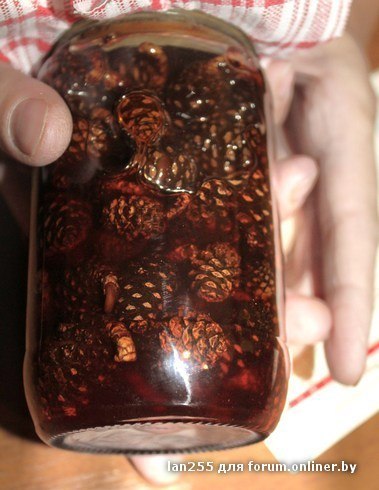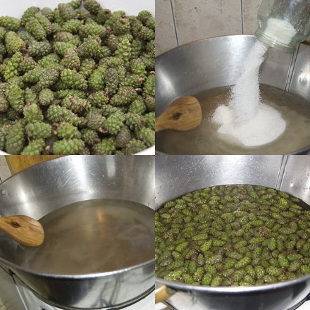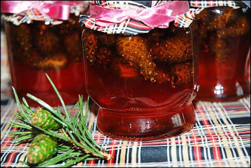 Банки накрываем чистой салфеткой или марлей, ставим в солнечное теплое место и встряхиваем время от времени, чтобы сахар полностью растворился и образовался сироп. Когда сахар растворится полностью, "солнечное" варенье можно пробовать. Закройте варенье плотной крышкой и поставьте в прохладное темное место. 3. рецепт "Фирменный". Собранные шишки промывают и разрезают для лучшей пропитки сиропом. Сироп готовят из расчета 1кг сахара на 1,5 стакана воды. Сахар используем в количестве 1,5 кг на 1кг шишек. Шишки заливают горячим сиропом и настаивают 3-4 часа. После этого смесь ставим на огонь, постепенно доводя ДО температуры кипения — примерно 80-85°С, снимаем с огня и выдерживаем до полного остывания. Затем повторяем нагревание еще раз. Важно: на этой стадии не кипятить!
