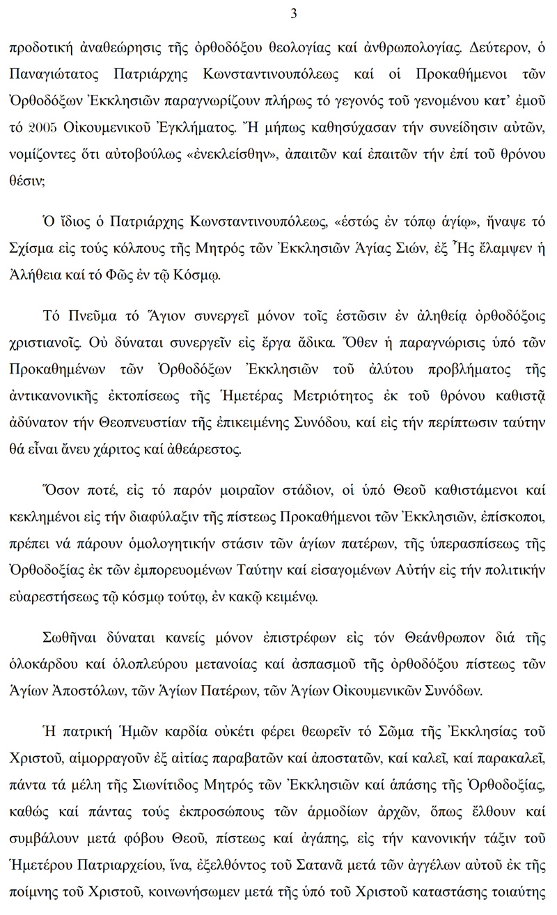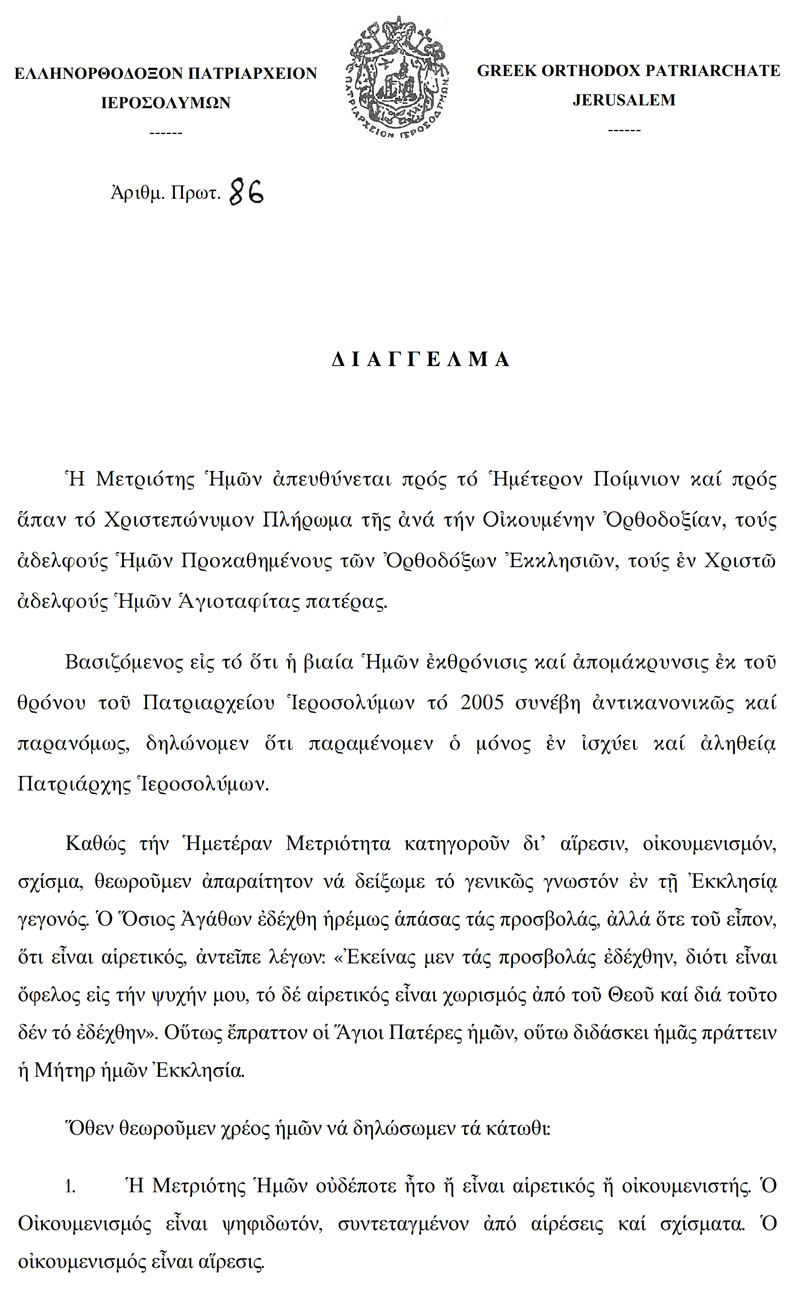 Наша Мерность обращается к Нашей пастве и ко всей Христоименитой Полноте Вселенского Православия, к Нашим братьям - Предстоятелям Православных Церквей, к Нашим во Христе братьям - Святогробским отцам. Основываясь на том, что насильственное Наше свержение и