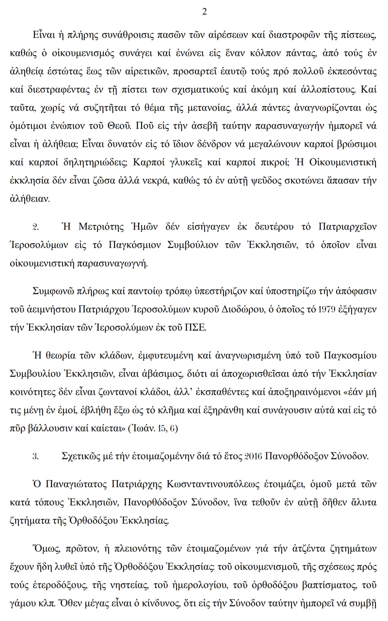 Патриархом Иерусалимским. В связи с тем, что Нашу Мерность обвиняют в еретичестве, экуменизме, расколе, считаем необходимым указать на такой общеизвестный в Церкви факт: преподобный Агафон спокойно принял все оскорбления, но когда ему сказали, что он еретик, то он возразил, сказав: «те оскорбления я принял потому, что это полезно для моей души, а это не принимаю, потому что быть еретиком - значит быть отлученным от Бога». Так поступали наши Святые Отцы, так учит нас поступать и наша Матерь Церковь. А потому, считаем своим долгом заявить нижеследующее: 1. Наша Мерность никогда не была и не является еретиком и экуменистом. Экуменизм – мозаика, сложенная из ересей и расколов. Экуменизм – это ересь. Это полное собрание всех ересей и извращений в вере, ибо экуменизм собирает и объединяет в единое лоно всех: от в истине стоящих до еретиков, присоединяет к себе давно отпавших и извратившихся в своей вере раскольников и даже иноверных. При этом вопрос о покаянии не обсуждается, но все они признаются равночестными перед Богом. Где же в этом нечестивом сборище может быть истина? Могут ли на одном древе расти и плоды съедобные, и плоды ядовитые? И плоды сладкие, и плоды горькие? Экуменическая церковь - она не живая, но мертвая, ибо ложь убивает в ней всякую истину. 2. Наша Мерность не вводила повторно Иерусалимский Патриархат во Всемирный Совет Церквей, который является экуменическим сборищем. Я полностью согласен и всемерно поддерживал и поддерживаю