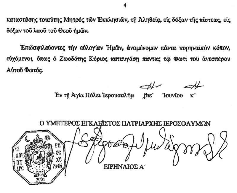 торгуют и вводят Его в политику угождения миру сему, лежащему во зле. Спастись можно только возвращением к Богочеловеку через всеусердное и всестроннее покаяние и усвоение православной веры Святых Апостолов, Святых Отцов, Святых Вселенских Соборов. Отеческое Наше сердце не выносит более вида Тела Церкви Христовой, кровоточащего по вине преступников и отступников, и призывает, и просит всех членов Сионской Матери Церквей и всего Православия, а также всех представителей компетентных органов, прийти и поспособствовать со страхом Божиим, верою и любовию, восстановлению канонического порядка в Нашей Патриархии, дабы, по исшествии сатаны с аггелами его из стада Христова, мы причастились Истины вместе с учреждённой самим Христом Матерью Церквей, во славу веры, во славу народа Бога нашего. Обильно ниспосылая Наше благословение, ожидаем всяческого киринейского труда, молясь, дабы Живодавец Господь осиял всех Светом невечернего Своего Света. Во Святом Граде Иерусалиме 2015 года, июня 20 дня ВАШ ПРЕБЫВАЮЩИЙ В ЗАТОЧЕНИИ ПАТРИАРХ ИЕРУСАЛИМСКИЙ ИРИНЕЙ I Послание в оригинале на греческом языке: