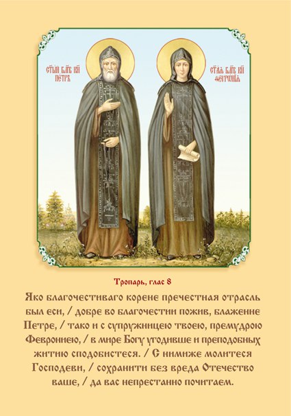 Благоверные князь Пётр и княгиня Феврония, Муромские чудотворцы. (ВИДЕО)Русская Православная церковь празднует день памяти святых благоверных князя Петра и княгини Февронии, Муромских чудотворцев, дата установлена в честь перенесения их мощей в 1992 году. Поскольку праздник 8 июля приходится на пору Петрова поста, который является строгим, а к этой дате ныне приурочен День семьи, то многие верующие, кто хотел бы совершить бракосочетание или венчание в этот день, не могут этого сделать, так как праздник приходится на пост.В связи с этим решением Архиерейского собора Русской Православной Церкви, состоявшегося в Москве 2–5 февраля 2011 года, Синодальной богослужебной комиссии было поручено «рассмотреть вопрос о дополнительной дате празднования памяти святых благоверных князя Петра и княгини Февронии Муромских. Имея в виду желание многих христиан вступить в церковный брак в день почитания этих покровителей супружества», и в 2013 году Архиерейский собор установил еще одну дату памяти святых благоверных Петра и Февронии Муромских – в честь перенесения их мощей в 1992 году. Память святых теперь будет ежегодно праздноваться каждое второе воскресенье сентября. В дни, посвященные памяти святых Петра и Февронии, за Божественной литургией на сугубой – то есть посвященной смыслу праздника – ектенье будут совершаться прошения о пребывании брачных уз, скрепленных Богом, «в мире и единомыслии, благочестии и чистоте», о даровании «домашним их церквам несокрушимой крепости и преспеяния в любви нелицемерней», и об умножении народа – «да возвеселятся люди Твои видением сынов и дщерей, и да умножится народ наш и благословение Твое наследуется в нем в род и род». Еще Синодом было поручено Синодальной богослужебной комиссии составить «текст молитвы для прочтения по окончании Божественной литургии в дни памяти святых Петра и Февронии, об умножении любви, укреплении семей, сохранении супружеской верности, даровании целомудрия еще не вступившим в брак и о помощи им, готовящимся к вступлению в семейную жизнь». От нетленных мощей святых благоверных Петра и Февронии Муромских до сих пор совершаются чудеса, счастливо меняются судьбы, совершаются исцеления, а сестры Свято-Троицкого монастыря по-прежнему записывают эти свидетельства, ценные для нас и наших потомков, для всей Русской Православной Церкви, ибо: «Дивен Бог во Своих святых»! Святым благоверным Петру и Февронии Муромским молятся о семейном благополучии и о счастье в браке. МОЛИТВА первая: О велицыи угодницы Божии и предивнии чудотворцы благовернии княже Петре и княгине Февроние, града Мурома предстатели и хранители, и о всех нас усерднии ко Господу молитвенницы! К вам прибегаем и вам молимся с упованием крепким: принесите за нас грешных святыя молитвы ваша ко Господу Богу и испросите нам у благости Его вся благопотребная душам и телесем нашим: веру праву, надежду благу, любовь нелицемерну, благочестие непоколебимое, в добрых делех преуспеяние, мира умирение, земли плодоносие, воздуха благорастворение, душам и телесем здравие и вечное спасение. Исходатайствуйте у Царя Небеснаго: верных рабов Его, в скорби и печали день и нощь вопиющих к Нему, многоболезный вопль да услышит и да изведет от погибели живот наш. Испросите Церкви святей и всей державе Российстей мир, тишину и благоустроение, и