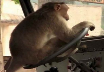 Водитель оставил двигатель работающим, и две макаки забрались в водительское кресло и сумели проехать некоторое расстояние, пока автобус не врезался в другой автобус.