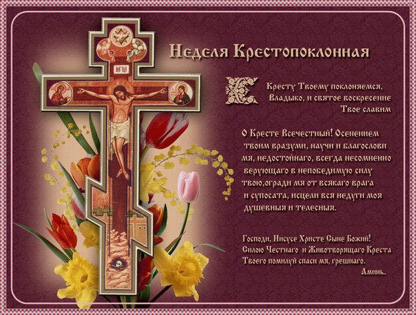 Крестопоклонная...В воскресенье третьей недели Великого Поста на всенощном бдении в центр храма выносится Животворящий Крест, которому всю Неделю поклоняются верующие. Как путник, уставший от долгой дороги, отдыхает под раскидистым деревом, так и православные христиане, совершая духовное путешествие в Небесный Иерусалим – к Пасхе Господней, находят в середине пути «Древо крестное», чтобы под его сенью набраться сил для дальнейшего пути.Или как перед приходом царя, возвращающегося с победой, вначале шествуют его знамена и скипетры, так и Крест Господень предваряет Христову победу над смертью – Светлое Воскресение.При сем поклонении поется песнь: Кресту Твоему покланяемся, Владыко, и Святое Воскресение Твое славим. Церковь выставляет, в середине Четыредесятницы, верующим Крест для того, чтобы напоминанием о страданиях смерти Господней воодушевить и укрепить постящихся к продолжению подвига поста. Поклонение Кресту продолжается и на четвертой неделе поста – до пятницы, и потому вся четвертая неделя называется крестопоклонною. «Крест – хранитель всей вселенной, Крест – красота церкви, крест – царей держава, крест – укрепление верующих, крест – ангелов слава и демонов язва».Так объясняет одно из церковных песнопений значение креста для всего мира. «Тростию Креста, обмакнув ее в красные чернила Твоей крови, Ты, Господи, по-царски подписал нам прощение грехов» – говорится в одной из стихир Праздника.