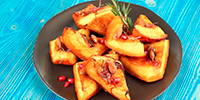 Добрым хозяюшкам на заметку... Тыква, запечённая с мёдом и розмариномПриготовление Нарежьте мякоть тыквы вместе с кожурой крупными кусками. Выложите их шкуркой вниз на противень, застеленный пергаментом. Посыпьте тыкву смесью белого и коричневого сахара. Полейте мёдом и раскидайте сверху листики розмарина. Поставьте в разогретую до 200 °C духовку на 40 минут.Ингредиенты: