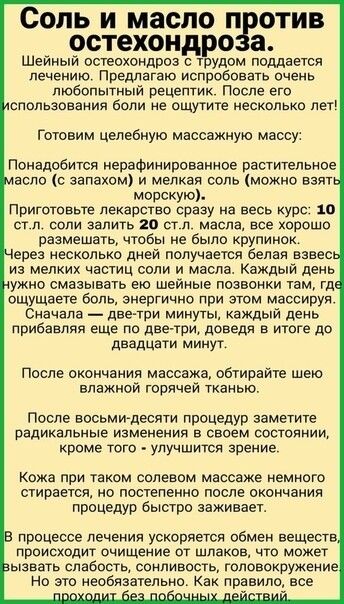 Будьте здоровы! Соль и масло против остеондрозаШейный остеохондроз с трудом поддаётся лечению. Предлагаю использовать очень интересный рецепт. Благодаря этой массажной массе действительно надолго уходит ломяще-ноющая боль в области шеи.
