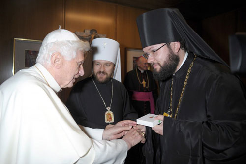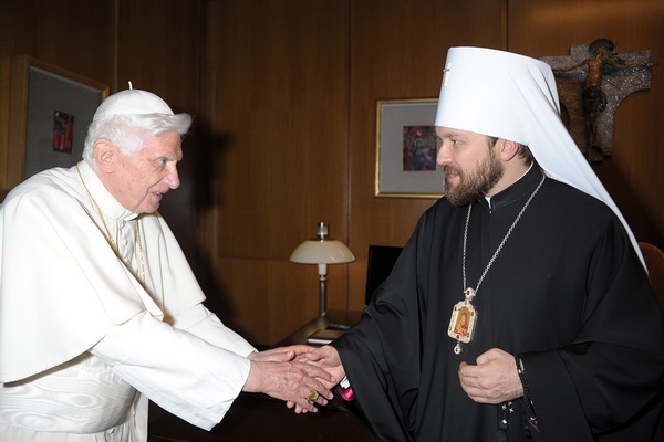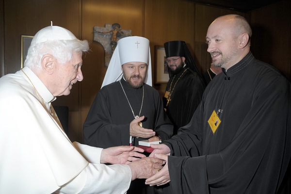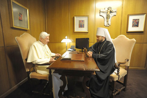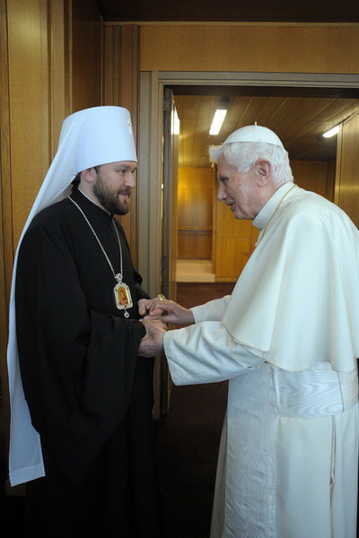 Митрополит Иларион (Алфеев) 16-го октября вновь встретился с папой Бенедиктом XVI. На этот раз встреча происходила в Ватикане после сессии "синода” католических епископов, на которой митр. Иларион выступил с приветствием в экуменическом духе, сказав, что "лишь объединив силы, мы сможем защитить христианскую веру, преодолеть настоящий кризис, возвысить голос нашего общего свидетельства миру, сообщить людям новое слово Евангелия" и прочее, и прочее, и прочее...