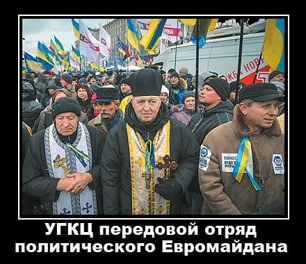 В последние два месяца с появлением так называемого "евромайдана" антигосударственная деятельность греко-католиков на Украине перестала быть скрытной. Уже через 3 дня, после справедливого отказа правительства Украины от Ассоциации с ЕС, её лидер Святослав Шевчук выразил солидарность организаторам и участникам будущих погромов. А 1 декабря в день захвата Киевской городской администрации и штурма Администрации Президента Шевчук официально призвал все монастыри и церкви УГКЦ подключится к "евромайдану" а это значит что почти 4 тысячи приходов теперь круглосуточно проводят антигосударственную деятельность отправляя на революцию своих прихожан обеспечивая их всем необходимым. Глава Греко-Католической семинарии Гудзяк стал одним из активнейших вдохновителем и организатором революции. Эти люди не скрывают на своем сайте того факта, что по Европе они собирают деньги на нужды "евромайдана" для государственного переворота. Но самое страшное это то что спикеры УГКЦ дерзают представлять преступный бунт как волю Божию тем самым занимаясь "духовным терроризмом".
